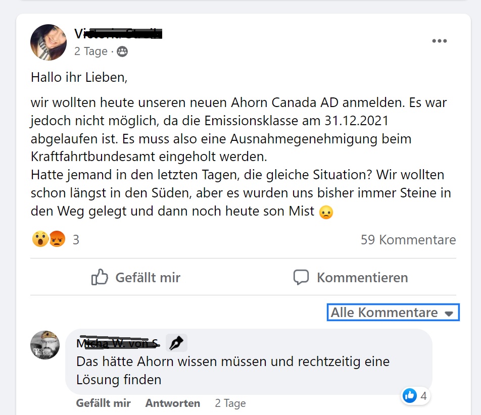 Im Ahorn Forum häufen sich die Beschwerden, das Ahorn Fahrzeuge ausliefert, die nicht zugelassen werden können, da die Genehmigung für Euro 6temp am 31.12.2021 abgelaufen ist.