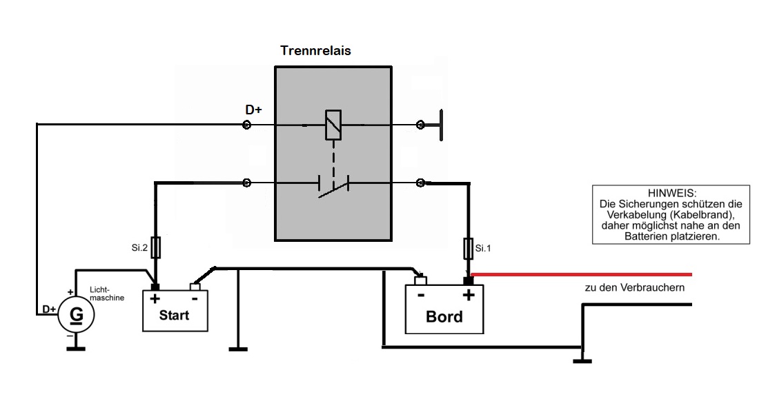 Normalerweise werden die Pluspole der Starterbatterie und der Aufbau Versorgungsbatterie mit einem Trenn Relais verbunden, sobald die Lichtmaschine läuft. Meist wird das D+ Signal von der Lichtmaschine verwendet um diese Relais anzusteuern.