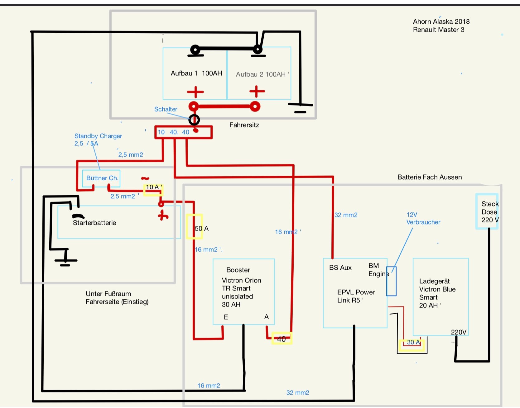 Und das D+ Signal an den Booster anschließen, nicht die Spannungssteuerung verwenden. Denn wenn dann der Kühlschrank während der Fahrt auf 12 Volt anspringt, bricht die Spannung zusammen und der Booster schaltet ab, weil der glaubt der Motor wurde abgeschaltet.