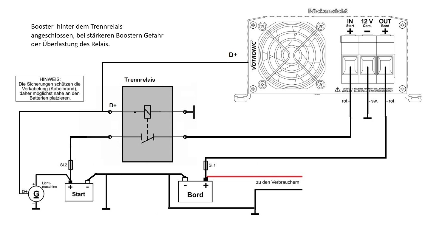 Es gibt auch alternativ die Möglichkeit den Booster vor oder hinter dem Trennrelais einzuschleifen, jedoch ist dies nur bei Boostern von bis zu 30Amp. zu empfehlen. Der Strom eines