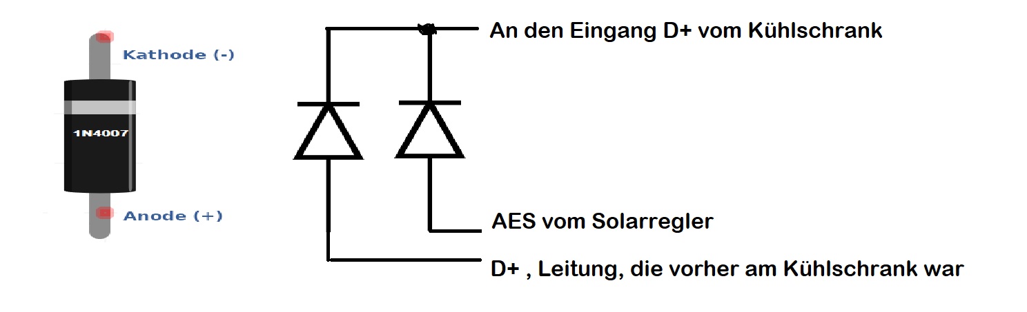 Es besteht auch die Möglichkeit die AES Leitung vom Solarregler, an den Kühlschrank anzuschließen. Bei Kühlschränken, die noch keinen AES Eingang haben, muss man dort den D+ Eingang verwenden. D+ ist das Signal, welches meldet, das die Lichtmaschine läuft und 12 Volt ausreichend zur Verfügung steht. Man muss das AES Signal und das D+ Signal mit 2 Dioden (1N4007 oder ähnliche) entkoppeln. Wenn nun ausreichend Solarstrom zur Verfügung steht und die Batterie voll ist, schaltet der Solarregler das AES Signal ein. Der Kühlschrank glaubt nun das die Lichtmaschine läuft und schaltet auf 12 Volt um und verwendet somit den kostenlosen Solarstrom. So spart man Energie (Gas, 230 Volt). Dazu den Kühlschrank auf Automatik einstelllen.
