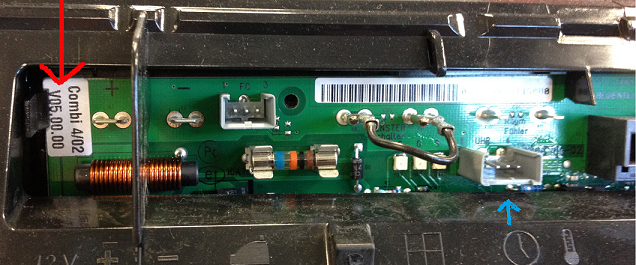 Platine vor 2018 mit Softwarestand 05.00 (roter Pfeil) ; Platinen ab 2018 erkennt man daran, das der Anschluss für die Schaltuhr fehlt (blauer Pfeil) diese haben auch andere Versions Nummern.)
