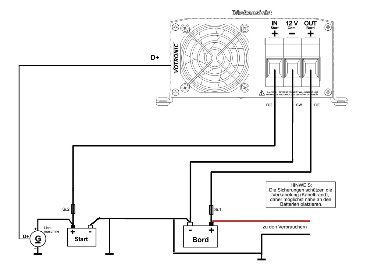 Und das D+ Signal an den Booster anschließen, nicht die Spannungssteuerung verwenden. Denn wenn dann der Kühlschrank während der Fahrt auf 12 Volt anspringt, bricht die Spannung zusammen und der Booster schaltet ab, weil der glaubt der Motor wurde abgeschaltet.