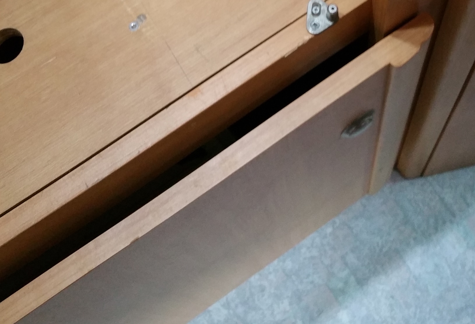 Alternativ könnte das Brett unten unter der Türe vom Schrank von innen befestigt werden, so das unten hinter der Türe ein , von außen, unsichtbarer Spalt von ca. 16mm entsteht.