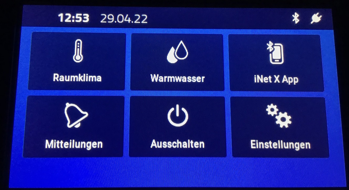 Oben rechts das Steckersymbol zeigt an, das der 230 Volt Landstrom verfügbar ist. Das Bluetooth Symbol zeigt an, das Bluetooth aktiv ist.
