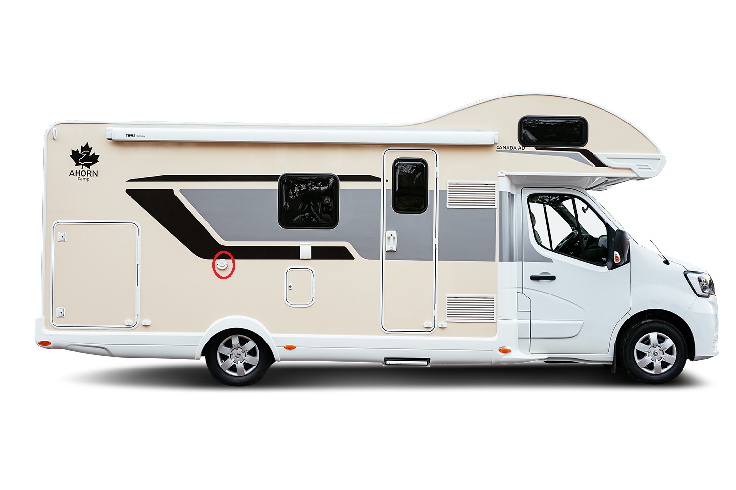 Da hat Ahorn nicht so besonders mitgedacht den Abgasauslass, der Truma Combi Heizung, fast mittig zwischen Heckgarage und Türeingang auf der Markisenseite zu machen.