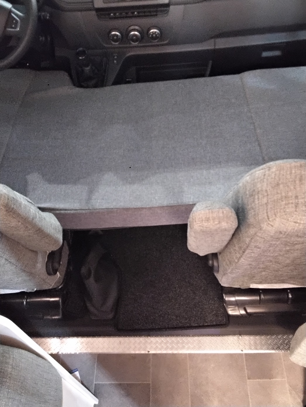 Das Kissen auf dem Fahrersitz wird nach oben weggeklappt. das auf dem Beifahrersitz kann nach unten weggeklappt werden. Im mittleren Kissen ist in der Unterseite ein dünnes stabiles Brett, damit es sich nicht durchbiegt.